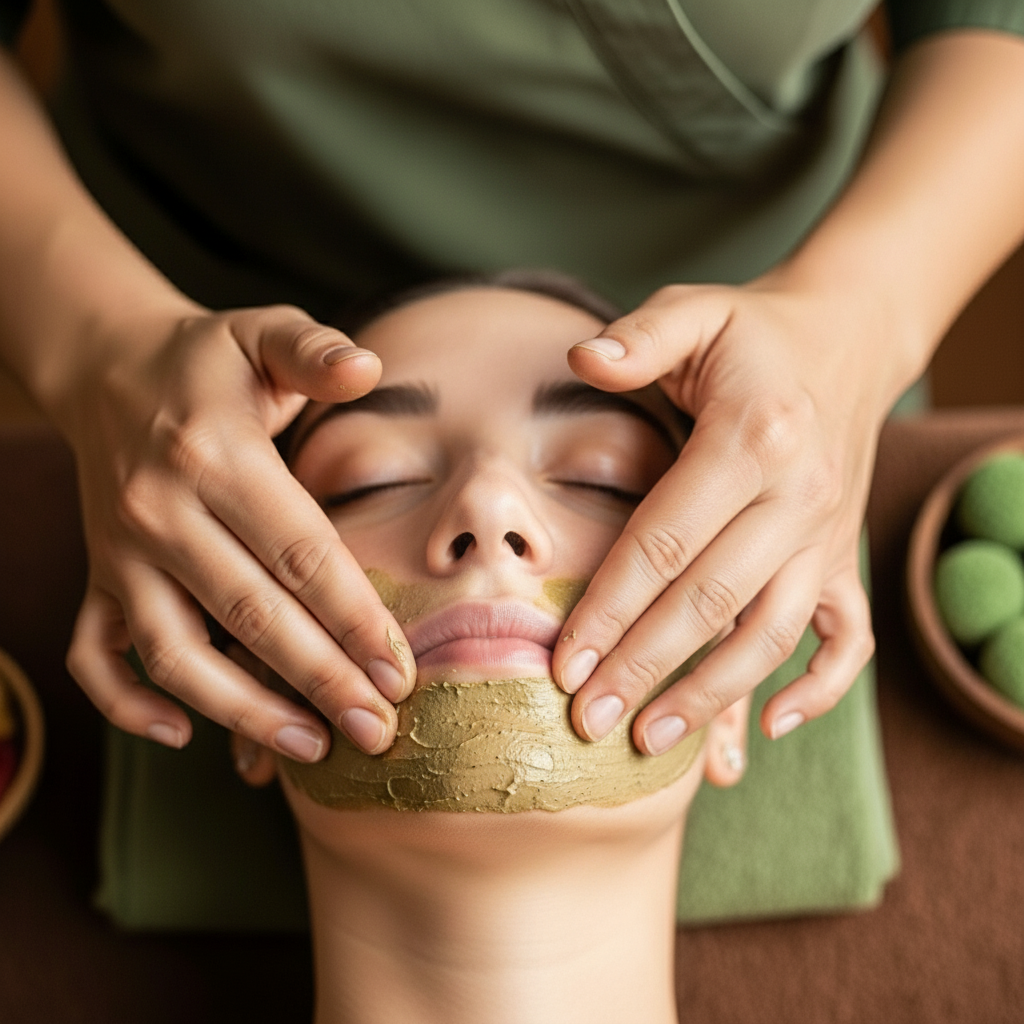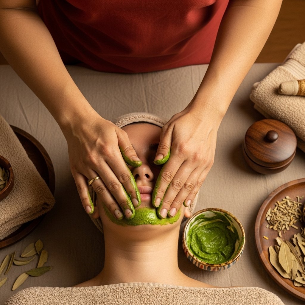 This treatment does not use chemical-based cosmetic products — instead, it involves an application of medicated herbal pastes that penetrate deeper cutaneous layers, improve skin metabolism, and support Twak Dhatu health.