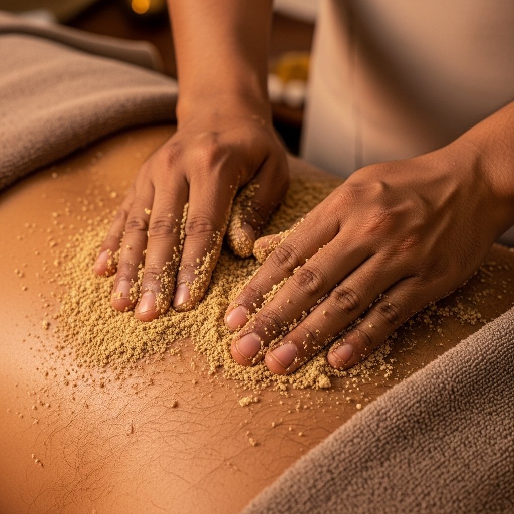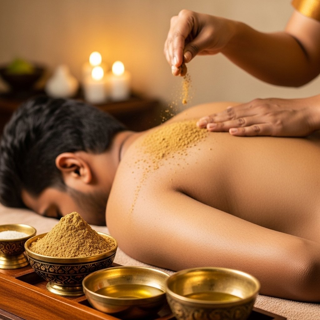 Udvartanam is a classical Ayurvedic body-scrubbing therapeutic procedure using medicated herbal powders (Ruksha Choorna) or herbal paste mixed with oil, applied in a specialised upward-directional massage technique.